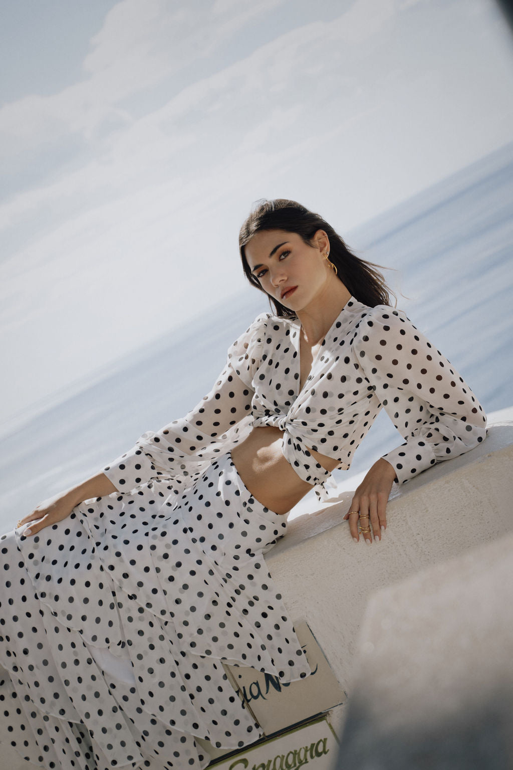 Top confeccionado en gasa ligera con fondo marfil y un estampado de lunares negros juguetones.