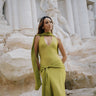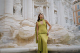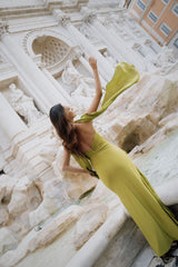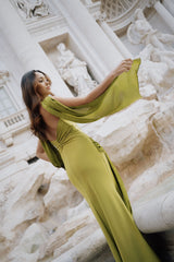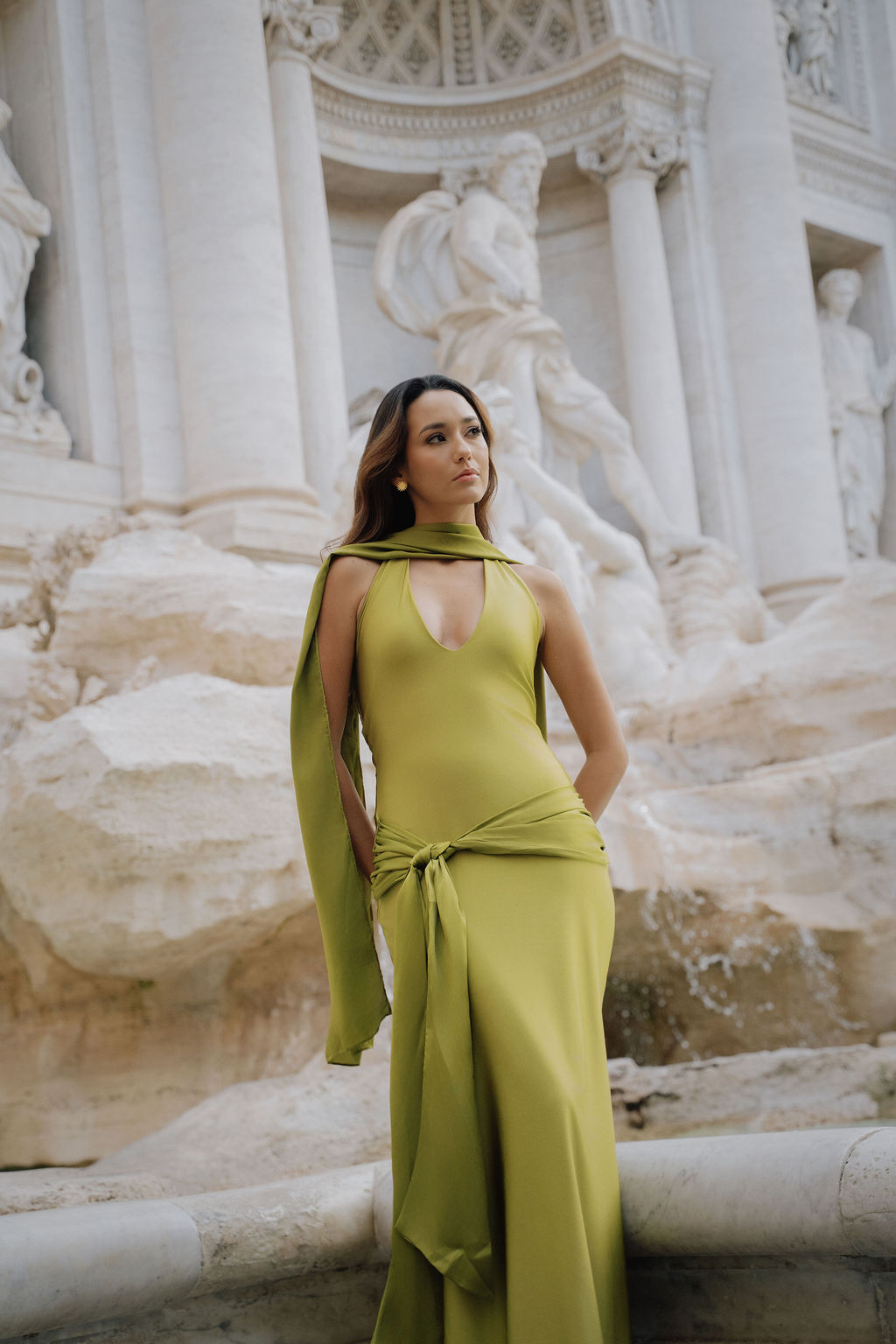Tiene una espalda abierta profunda con un detalle de cadena dorada y nuestro logo característico, que aportan un toque de sofisticación.