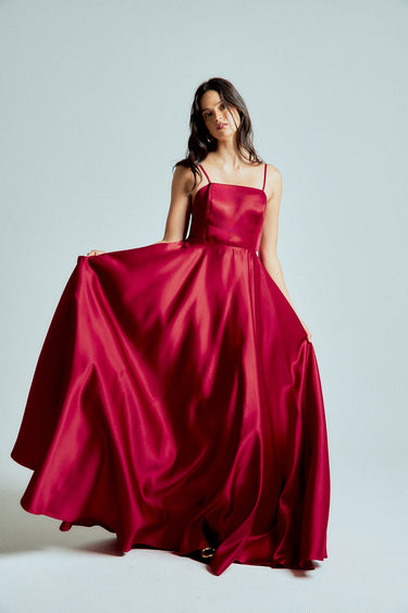 Vestido largo en raso opaco de caída estructurada que crea una silueta amplia y elegante. El escote recto con tirantes finos aporta delicadeza, mientras la espalda abierta suma un toque sofisticado y femenino. La falda de gran volumen se mueve con cada paso creando un efecto espectacular, y los bolsillos laterales aportan un detalle moderno y práctico.